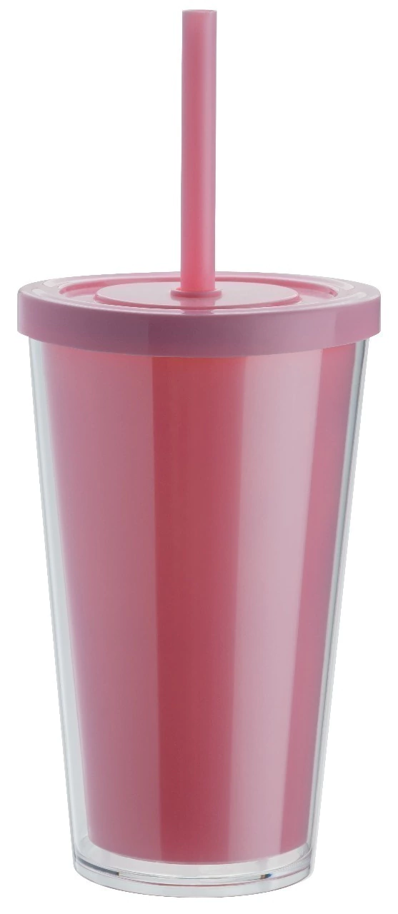 Material: Copo externo em PS Cristal, copo interno e tampa em PP e canudo com anel travador.