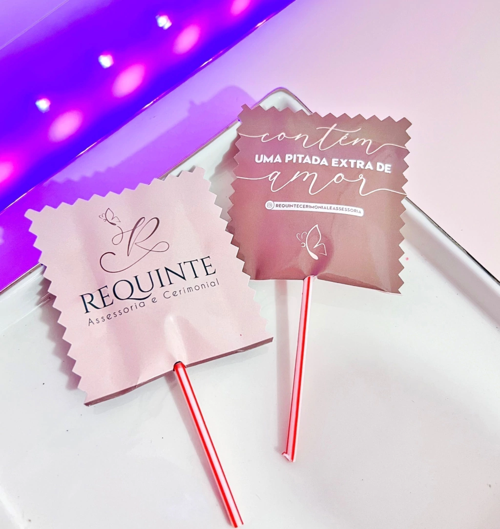 - O pirulito não sai de sua embalagem original, o que permite uma maior durabilidade e evita a contaminação. Por cima da embalagem original, estará a embalagem personalizada.